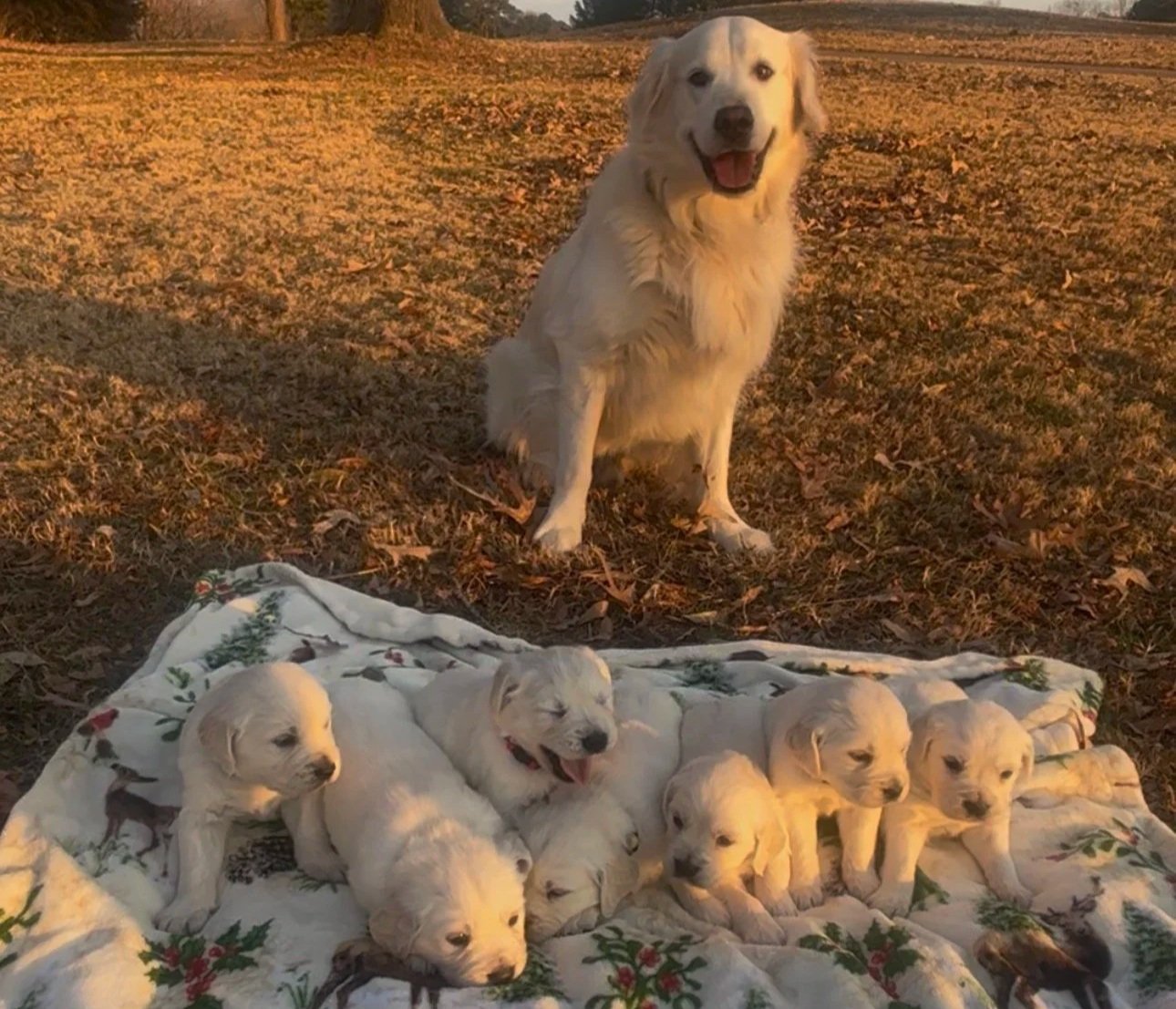 Hali and Banks welcomed their first litter of puppies on November 26th. Hali and Banks are both AKC registered purebred English Cream Golden Retrievers. They welcomed 7 little pups to this world. The two of them love to be together especially in their matching Christmas outfits.
